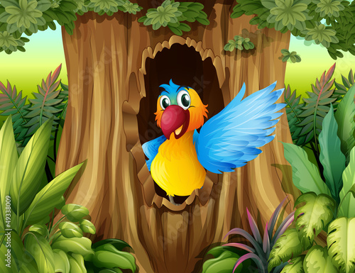 Cute toucan exotic bird sitting inside tree hollow vector illustration isolated on white background