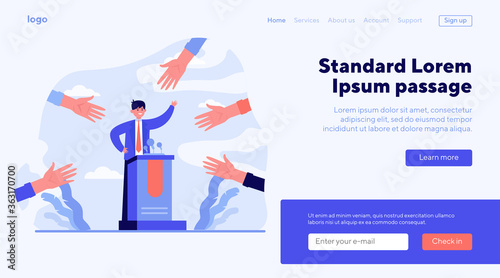 Candidate election campaign. Hands of voters pointing at politician flat vector illustration. Political leader, voting, referendum concept for banner, website design or landing web page
