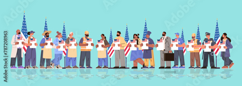 election day concept different occupations voters casting ballots at polling place during voting mix race people putting paper ballot in box full length flat horizontal copy space