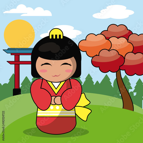 Cute japanese kokeshi doll character. Cartoon vector illustration