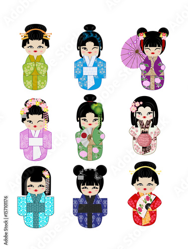 Set of Cute Traditional Japanese Kokeshi Dolls set. Kawaii asian girls in kimono. Vector isolated illustration collection.