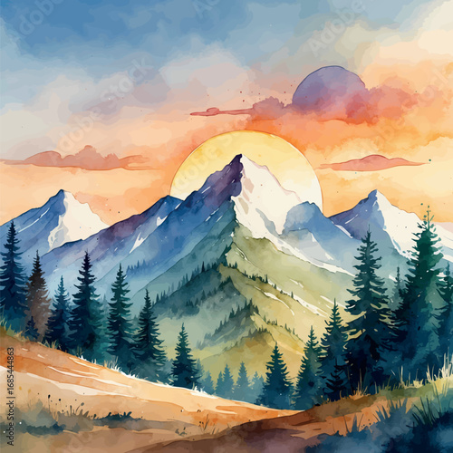 Purple and teal mountain illustration under a glowing dawn, representing hope and serenity. orange sky sunset color vector backgrounds.