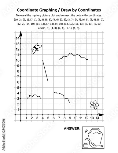 Coordinate graphing, or draw by coordinates, math worksheet with big mushroom and a snail: To reveal the mystery picture plot and connect the dots with given coordinates. Answer included.
