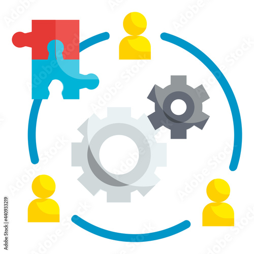 Teamwork business concept. People with abstract geometric shapes, business coworkers collecting figures vector illustration set. Partnership and teamwork concept