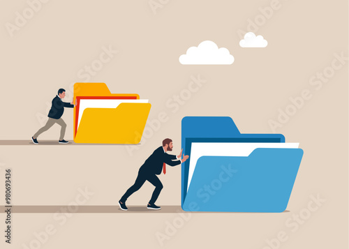 Business professionals managing digital documents and physical files, using online interface and archive cabinet for efficient data organization and retrieval. Office teamwork concept.