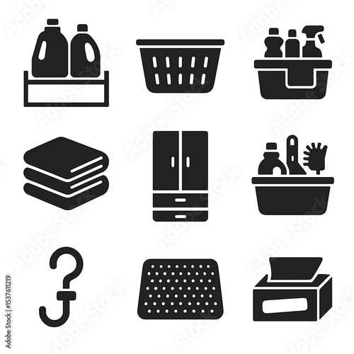 Laundry Room Icons. Solid, filled icons set of laundry room organization: detergent shelf, basket icon, folded