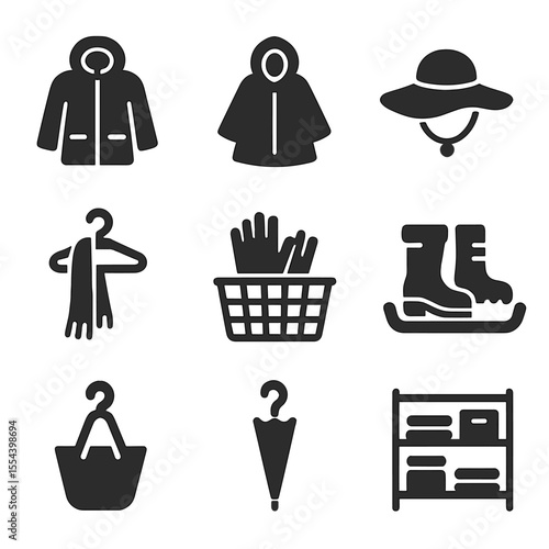 Seasonal Gear Icons. Solid, filled icons set of seasonal gear storage: winter coat, rain poncho, sunhat, scarf