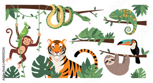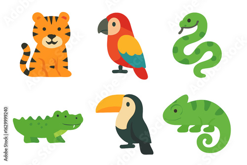 Vibrant jungle animals collection featuring jaguar, sloth, snake, toucan, parrot, frog, and butterfly for educational and design projects