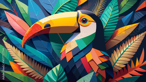 A colorful tropical toucan with a large beak perches on a branch in the wild rainforest