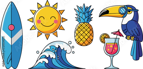 Colorful tropical summer icons collection with beach, sea, and vacation elements