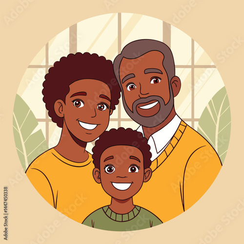 Four generations of men. Heartwarming family portrait illustration. Toddler, youth, adult, senior. Male lineage, ancestry, heredity. Family bond, love, fatherhood, continuity. Nostalgic drawing.