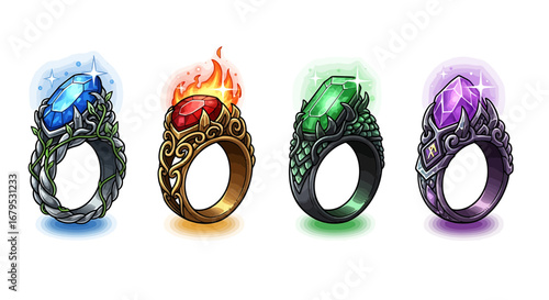 Fantasy icons of magical emblems, rings, amulets, and enchanted accessories
