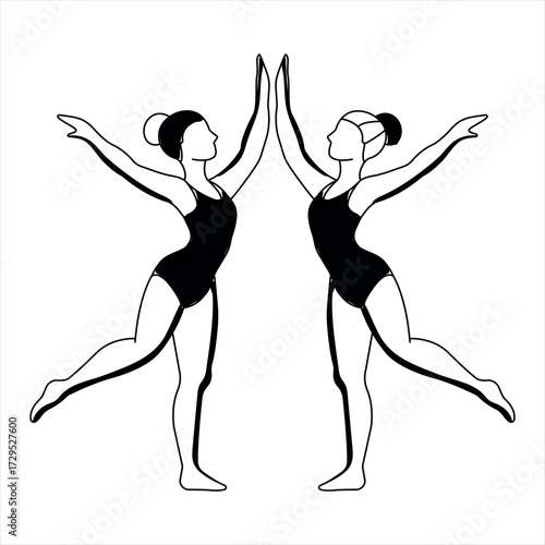 Rhythmic gymnastics silhouettes, ribbon performance, gymnast poses, artistic sport, dance movement, flexibility, balance, coordination, competition, elegance, athletic performance,