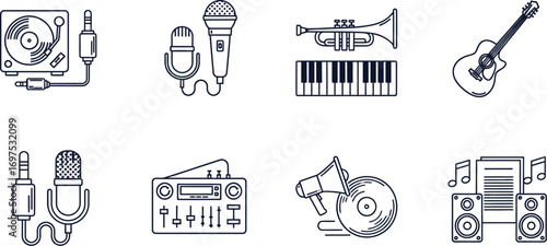 Stylish line art vector illustration featuring musical instruments and audio equipment for creative projects and media design