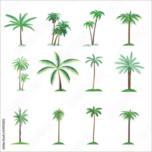 Coconut palm tree (Cocos nucifera). Set of realistic vector illustrations on white background.