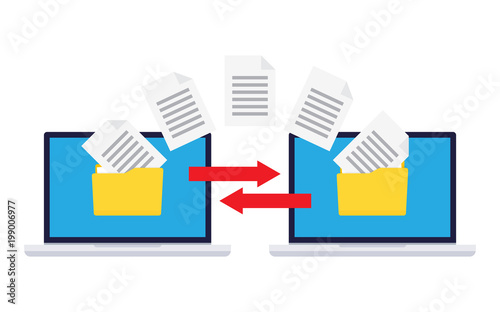 File transfer flat isometric vector concept. Circular arrows are moving indicating data exchange between two office employees.