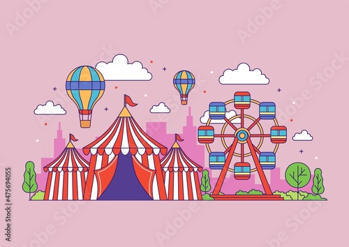Vector illustration. Ferris wheel. Carnival. Funfair background. Circus park. Roller coaster