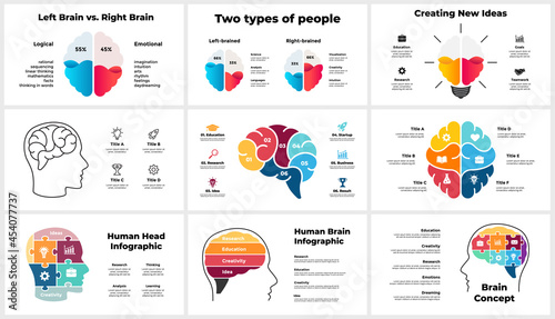 Comparison of left and right brain and cerebral hemispheres concept. Left brain made of jigsaw puzzle pieces, right brain made of layers of colors.