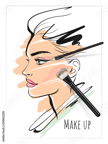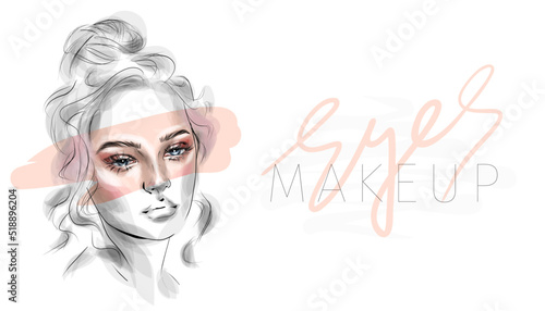 Beautiful woman face makeup vector fashion illustration. Hand drawn line art sketch for cosmetic products sale banner background design, make up artist business card template.