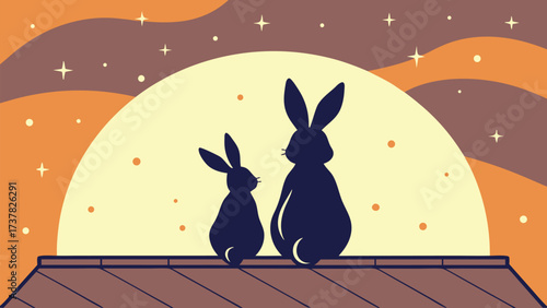 vector flat color cartoon illustration of Enchanted moonrise, Silhouette landscape with a cute unicorn under a mystical moon