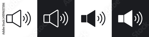 Volume and sound level icon set, speaker audio symbols, sound wave increasing, loudspeaker vector illustration, media control icons, sound adjustment graphics, black and white minimal design