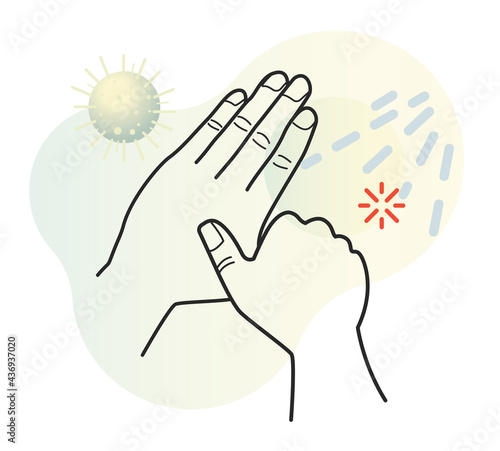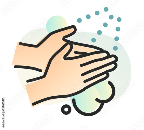 Washing hands to sanitize and disinfect COVID-19 Coronavirus pathogens from your hands concept, man washing hands with alcohol gel or soap with bubbles and COVID-19 virus pathogen on her hands.