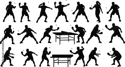 Table tennis silhouette set, black vector art, ping pong action pose, forehand and backhand stroke, sports motion, ball movement