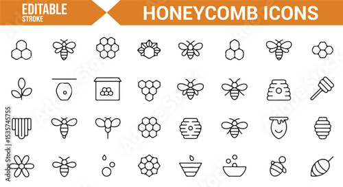 Bee Farm Management Vector Icons Set. Beehive Tools, Beekeeping Equipment, Honey Production, Bee Products, Flowers, and Beehives. Editable Linear Collection.