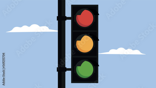 Vector Realistic Hanging Traffic Signal with Green, Yellow and Red Light. Traffic Light on Blue Sky Background
