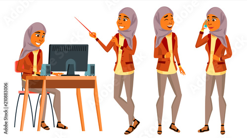 Arab Woman Office Worker Vector. Woman. Set. Hijab. Islamic. Business Human. Office Generator. Lady Face Emotions, Various Gestures. Front, Side View. Isolated Flat Cartoon Character Illustration