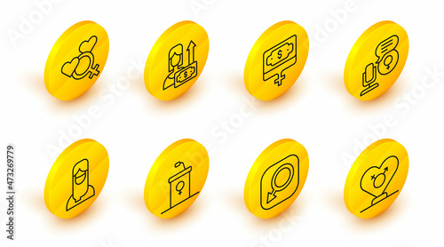 Set line Gender, Male gender, Debate podium rostrum, Muslim woman in hijab, Microphone, Money growth, and Female icon. Vector