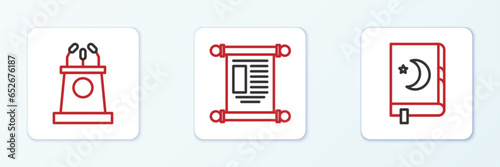 Set line Holy book of Koran, Stage stand tribune and Decree, paper, parchment, scroll icon. Vector