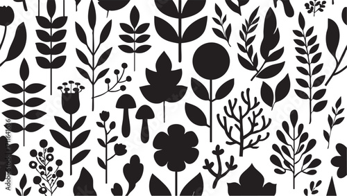 Black silhouette icons of mushrooms teapots bottles and decorative plants