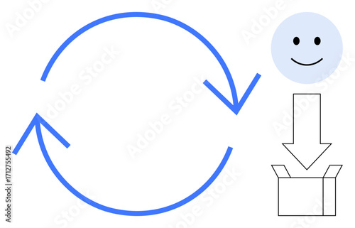 Circular arrow signifying a process, a smiling face representing positivity, and a downward arrow pointing to an open box. Ideal for workflow, feedback loop, improvement, efficiency, positivity