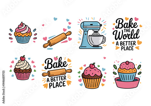 Baking Icons Set Cupcake Rolling Pin Donut Whisk Mixer Bread Oven Apron Cake