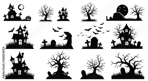 Halloween Cemetery Silhouette Icons Haunted House, Vampire, Witch Hat, Spiderweb, Ghost, Pumpkin, Bat, Cat, Broom, Raven, Tombstone, and Wolf