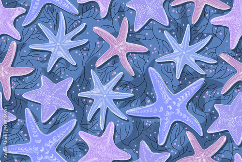 A detailed black and white seamless pattern of hand-drawn starfish and various seashells, perfect for a nautical-themed background.