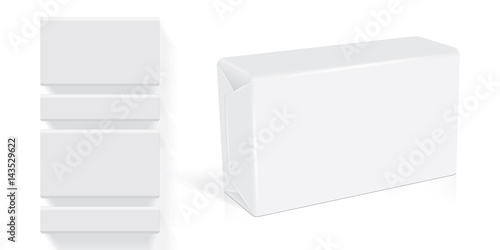 A bar of soap with bubbles floating around it, resting on the white background. Vector flat minimalistic isolated