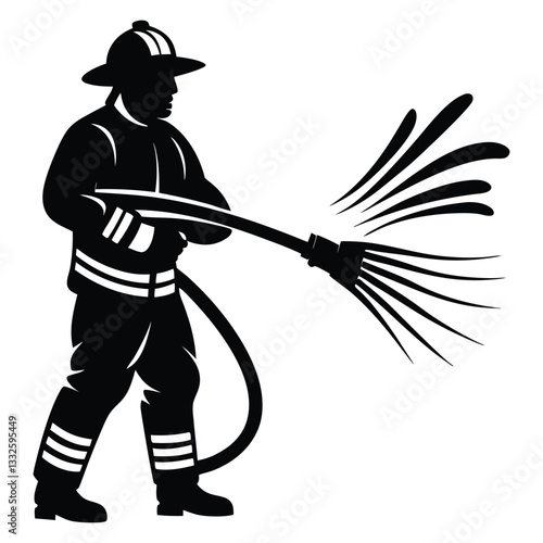 Firefighter in uniform holding a hose and spraying water on a white background.