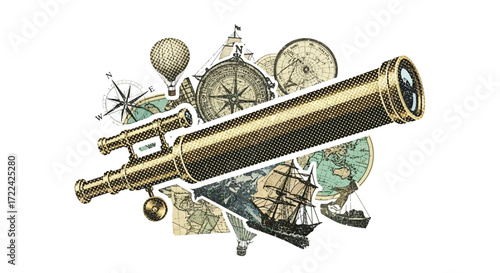 Illustration featuring a stack of rolled parchment maps, a brass telescope, and a compass, evoking themes of exploration and discovery.