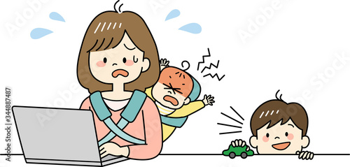2人の子供に泣かれ、困り果てるテレワーク社員
