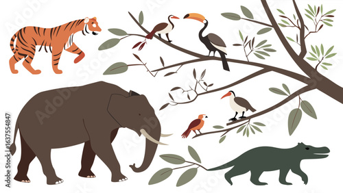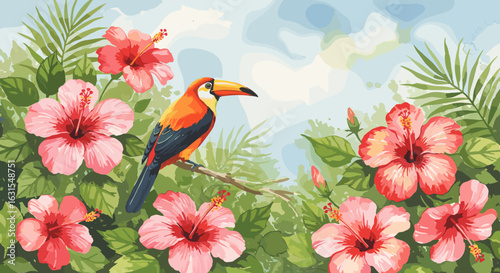 Tropical Paradise Exotic Wildlife and Lush Flora Illustration