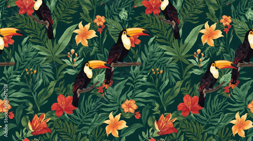 A colorful, cartoon-style vector illustration depicts a tropical toucan bird with a large yellow and black beak perched on a branch in the wild jungle