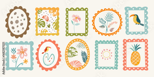 Collection of charming tropical themed decorative postage stamps with palm trees flowers pineapples and birds