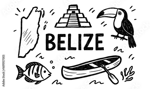 Various icons representing wildlife and nature include a parrot, leopard, monkey, toucan, snake, flower, waterfall, and a tribal mask, combining elements from diverse ecosystems.