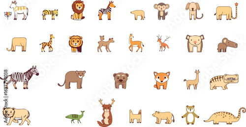 Cute safari animals vector set. Cartoon jungle wildlife collection for kids. Lion, giraffe, zebra, elephant, monkey, tiger. Baby shower and nursery decor design elements. Zoo animals.