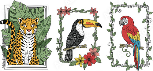 Illustration of tropical wildlife featuring a parrot toucan and chameleon for nature enthusiasts and animal lovers