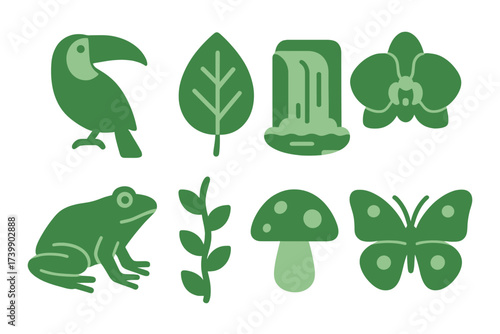 Rainforest Icon Set. Rainforest Aviary modern flat icon set: parrot, toucan, hummingbird, macaw, fern leaf, tropical flower, butterfly, canopy branch, fruit cluster, sunbeam, vines