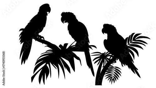 Collection of elegant tropical bird silhouettes — parrots, toucans, flamingos