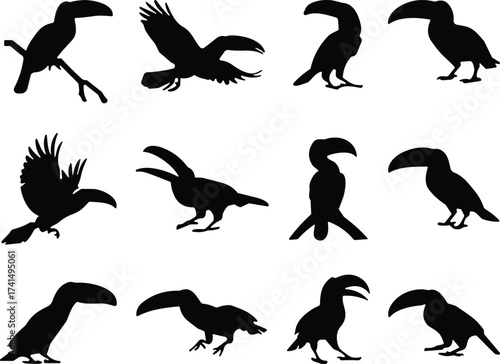 Assortment of Bird Silhouettes with Various Poses and Species flamingo toucan